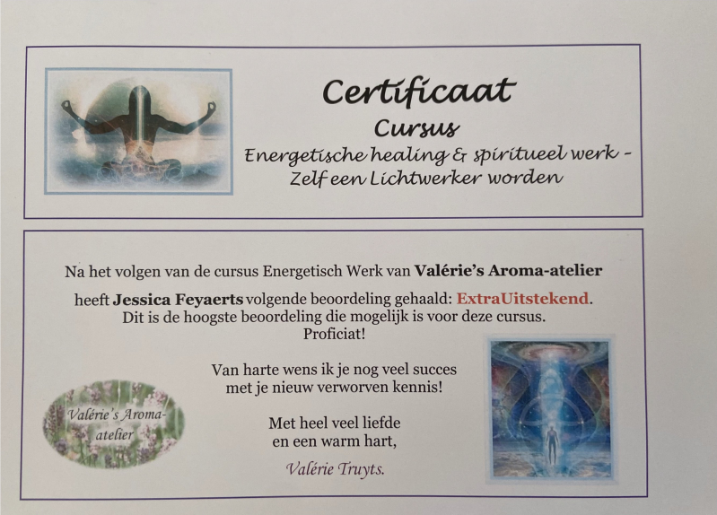 Ik werk vooral uit het hart en vanuit mijn innerlijke wijsheid en gevoel, waardoor ik geen klassieke kaartlegster ben, maar eerder een sjamanistische beoefenaar en energetisch bewustwordingscoach die jou wil helpen naar een bewustvoller leven. Doch heb ik alvorens dit te ontwikkelen wel enkele cursussen gevolgd toen ik het spirituele pad ben gaan bewandelen. Je kan ze hieronder bewonderen, behalve mijn basisopleiding Sjamanisme, waar ik geen certificaat van heb ontvangen (helaas). Dit heb ik gevolgd bij Roel Crabbé.